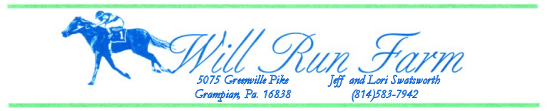 IF YOU HAVE QUESTIONS OR WISH TO INQUIRE ABOUT ANY OF OUR OFFSPRING, PLEASE CONTACT US AT:JEFF/LORI SWATSWORTHWILL RUN FARM5075 GREENVILLE PIKE